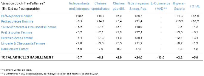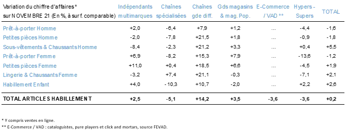 À fin novembre 2022, les ventes habillement sont supérieures de 5,0 % à celles de la même période de l’année 2021 mais elles restent en retrait par rapport aux onze premiers mois de l’année 2019 (- 7,1 %).