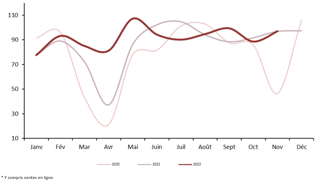 Les ventes en ligne des onze premiers mois de 2022 sont supérieures de 13,6 % à celles de janvier-novembre 2019