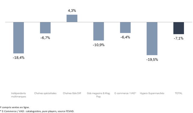 Les résultats définitifs du mois de novembre 2022 font état d’une très légère hausse de 0,2 % des chiffres d’affaires habillement des distributeurs par rapport à novembre 2021. Si l’on compare par rapport à la situation pré-Covid, l’activité commerciale de novembre 2022 reste inférieure de 6,1 % à celle de novembre 2019. Les résultats sont contrastés selon les circuits de distribution et on remarquera que le Black Friday n’a pas permis aux chaînes spécialisées d’enregistrer une activité commerciale supérieure à celle de novembre 2021.