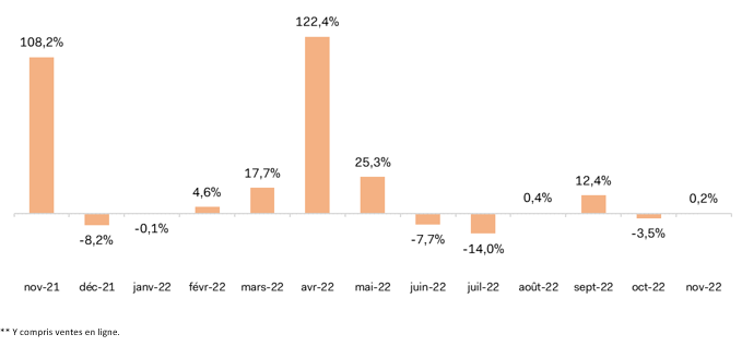 Évolutions mensuelles des ventes d’habillement de novembre 2021 à novembre 2022