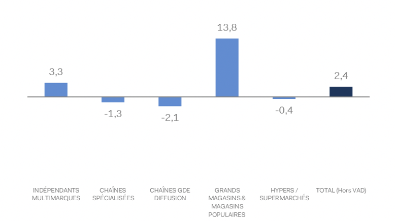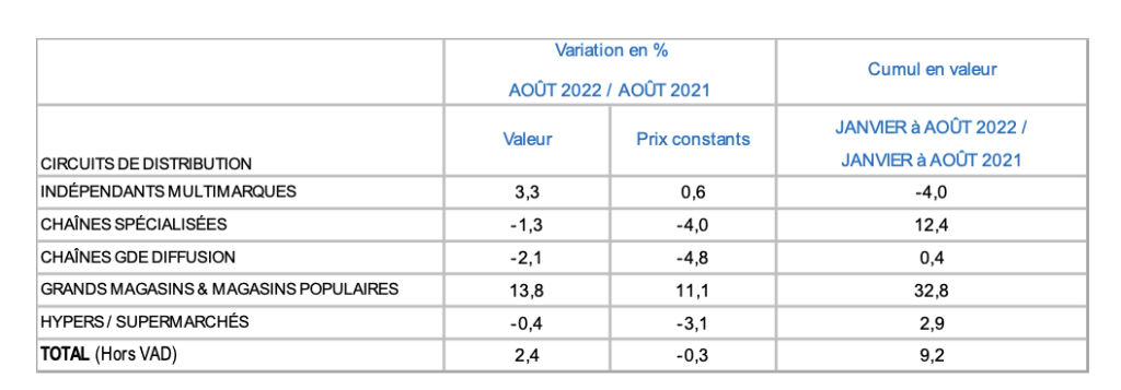 Pour les huit premiers mois de l’année 2022, si les chiffres d’affaires des distributeurs (hors VAD) sont supérieurs de 9,2 % par rapport à la même période de 2021, ils restent cependant encore en retrait des niveaux de 2019.