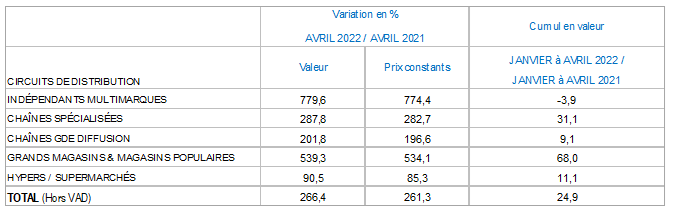 Les ventes des magasins physiques ont bénéficié d’un bond de 606,1 % en avril, tandis que les ventes en ligne (hors VAD) ont subi une chute de 54,2 % par rapport à la référence cependant très élevée d’avril 2021 (+ 61,5 % par rapport à avril 2020).
