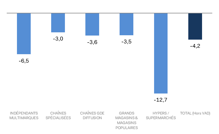 Pour l’ensemble de l’année 2023, les chiffres d’affaires des distributeurs (hors VAD) ont légèrement diminué en valeur (- 0,2 %) par rapport à 2022 (données provisoires), ce qui correspond compte tenu de l’inflation, à un repli plus prononcé des volumes.