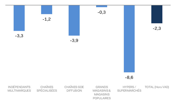 Tous les circuits de distribution ont subi une baisse des ventes d’habillement. Les résultats sont compris entre un repli de 0,3 % pour les grands magasins (magasins populaires inclus) et un retrait de 8,6 % pour les hypers et supermarchés.