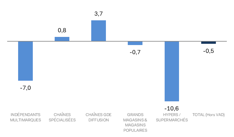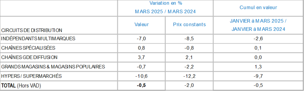 Selon les différents circuits de distribution, les résultats sont compris entre une hausse de 3,7 % pour les chaînes grande diffusion et un recul de 10,6 % pour les hypers-supermarchés. Les ventes en ligne (hors VAD) ont enregistré une croissance de 14,6 %, tandis que les ventes des magasins physiques se sont repliées de 2,7 % par rapport à mars 2024.