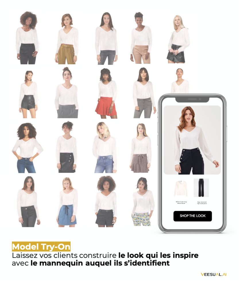 Selon une étude universitaire, l’intention d’achat augmente de 200% lorsque nous nous identifions au mannequin qui porte les vêtements que nous voulons acheter. C’est sur ce constat que Maxime Patte, CEO de Veesual.ai, et son équipe, ont construit leur solution de Try-On pour les marques de mode :