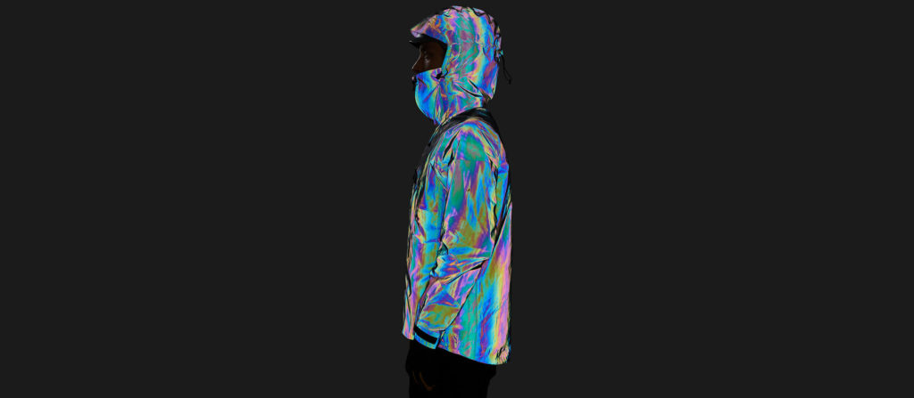 Conçue pour les sports d’hiver, la veste est entièrement imperméable et coupe-vent. Son esthétique varie en fonction de la lumière : elle ressemble à du métal lorsque la lumière est terne, alors que sous l’exposition d’une lumière vive, elle reflète instantanément toutes les couleurs du spectre visible. Lorsque la lumière touche la veste, elle traverse la surface incurvée des sphères de verre noires avant d’être renvoyée vers la source originale, de sorte que le tissu ressemble à une source de lumière. De quoi être vu.e facilement sur les pistes.